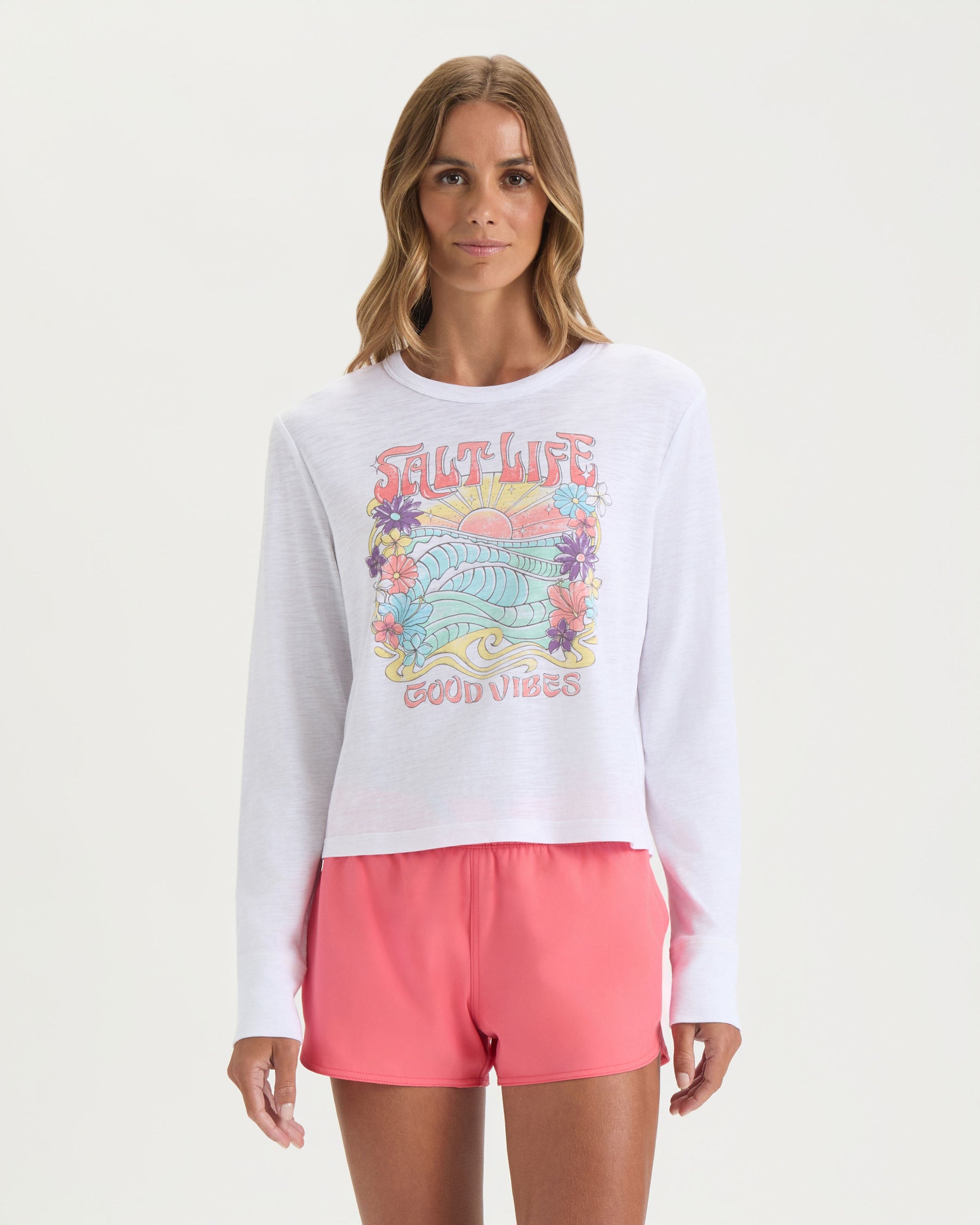 Start your day the coastal way in the Salt Life Women’s Sunrise Vibes Crew Neck Cropped Tee. With its relaxed cropped fit and soft cotton-blend feel, this long sleeve tee pairs effortlessly with your favorite shorts or joggers for easy, everyday comfort.
